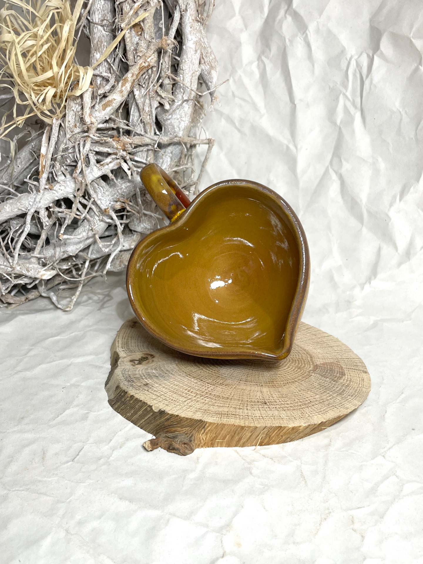 Keramická šálka v tvare srdiečka. Točená na hrnčiarskom kruhu z kameniny vhodná aj do umývačky riadu.